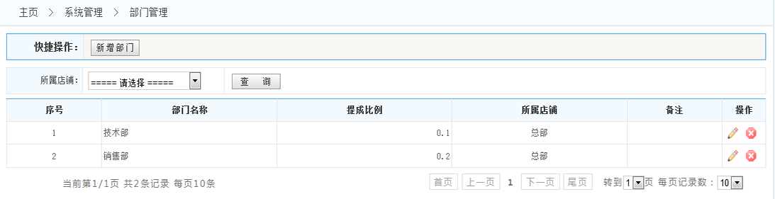 查看員工部門列表: 1.新增部門:添加新的部門 (見下圖) 2.查詢:可以根據(jù)店鋪的名稱 查詢該店鋪內的一些部門(默認查詢的是當前店鋪的子部門) 3.部門列表:在列表中的操作一欄 可以對該部門進行編輯或者是刪除