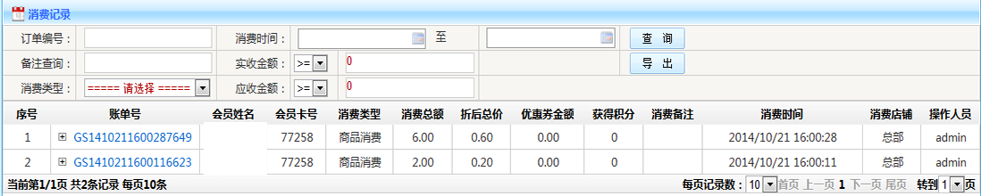 1.查詢:可以根據消費單號 時間段 消費類型等條件查詢