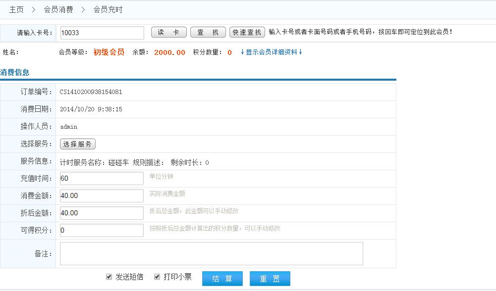 點(diǎn)擊選擇服務(wù)按鈕,選擇會(huì)員充時(shí)的計(jì)時(shí)服務(wù),然后輸入充時(shí)的時(shí)間,系統(tǒng)將自動(dòng)通過(guò)選擇的服務(wù)的規(guī)則計(jì)算出消費(fèi)金額、可得積分等數(shù)據(jù)并自動(dòng)填充