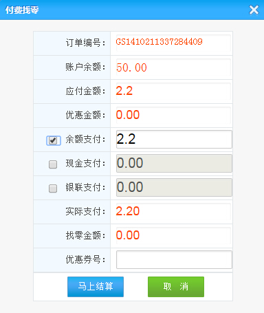 點(diǎn)擊結(jié)算圖標(biāo),將彈出付費(fèi)找零對(duì)話框,點(diǎn)擊馬上結(jié)算可完成此掛單消費(fèi):