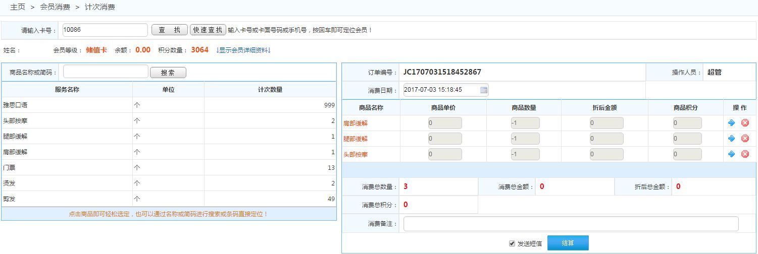 通過刷卡,或者通過查詢定位到會員,然后在左側選擇服務類型商品進行計次消費 如下圖: